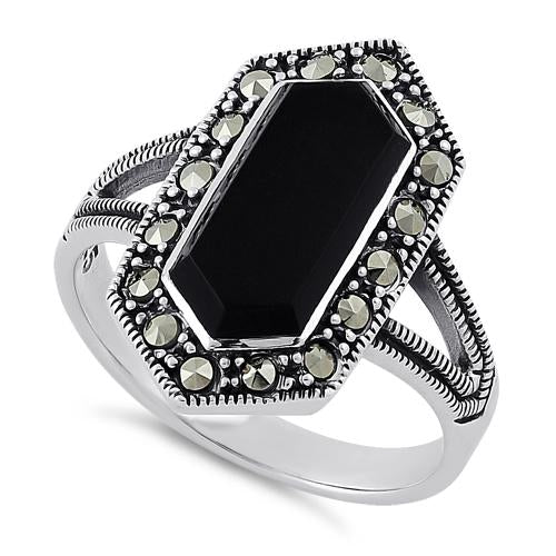 Sterling Silver Black Onyx Diamond Shaped Marcasite Ring